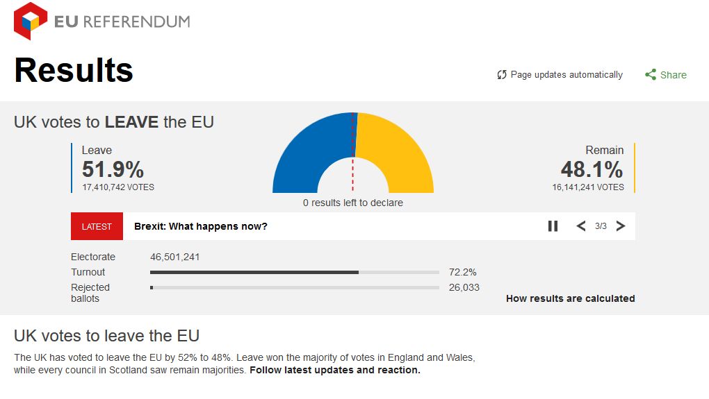 Як повідомляє ВВС-News, за вихід Британії з ЄС проголосували 17 410 742 виборців (51,9%), тоді як за те, щоб залишитися у складі ЄС проголосували 16 141 241, тобто 48,1%.