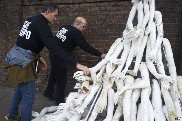 Пластикові частини тіла символізують травми, які отримують цивільні особи в результаті нанесення авіаударів по сирійським містам, зокрема, й по Алеппо, де загинули сотні мирних мешканців.