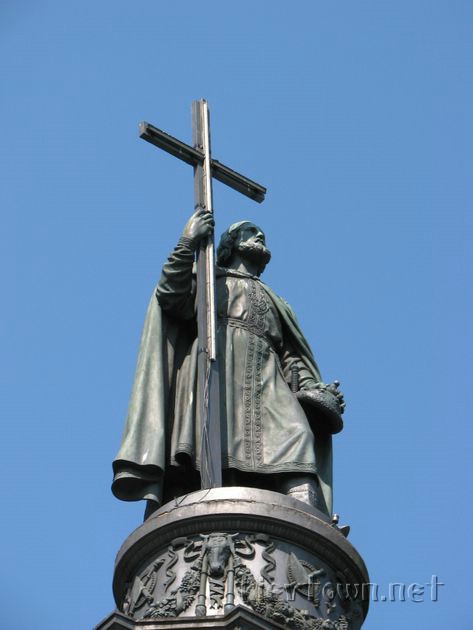 У Києві пам'ятник книязю Володимиру Великому звели ще 1853 року. Київський пам'ятник Володимиру стоїть з хрестом, шанобливо скинувши головний убор, при цьому меч у нього за поясом ледь видний. Натомість новий пам'ятник київському князеві у Москві має шапку і величезний меч.