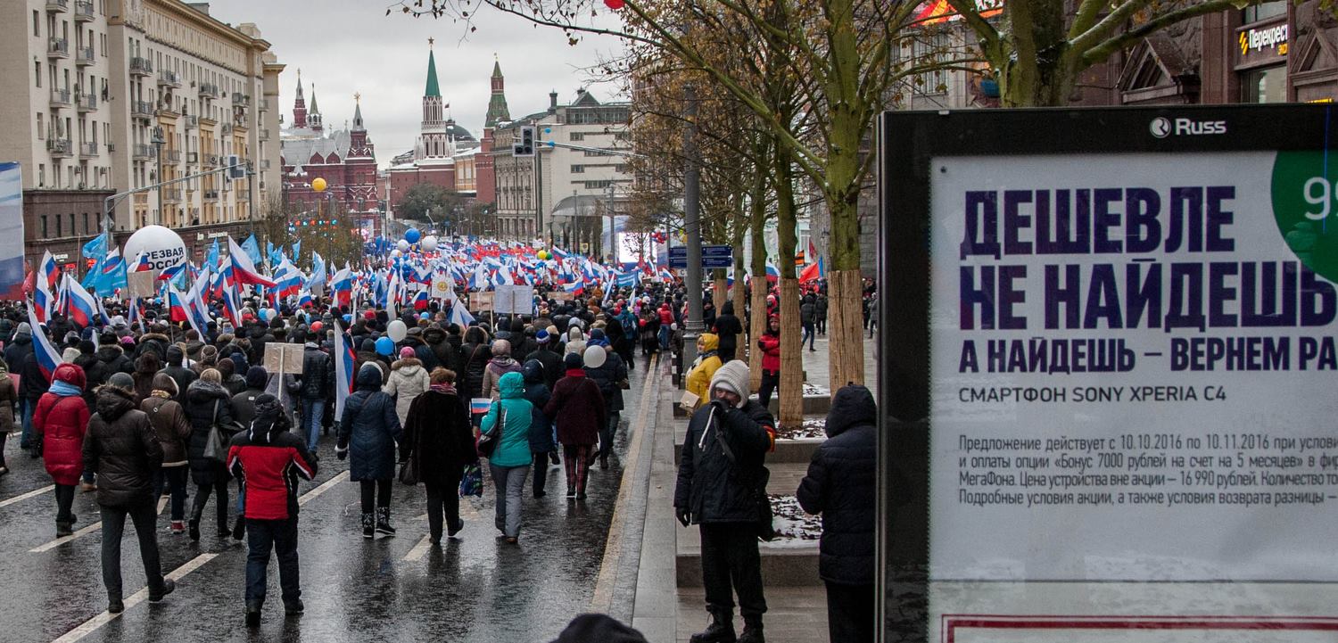 Пересічні москвичі мали можливість зігіртися коньяком і заробити від 200 до 500 російських рублів за участь в ході «Ми єдині!», а також у мітингу, організваних владою поблизу Кремля з нагоди державного свята – Дня народної єдності у п’ятницю, 4 листопада.