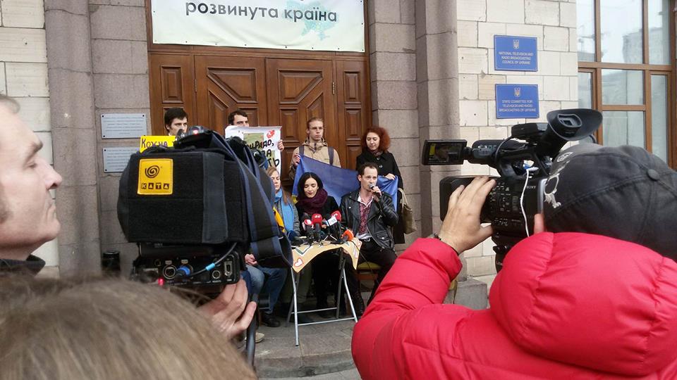 Українські співаки та громадські активісти зібрались під будівлею Національної Ради з питань телебачення та радіомовлення на акцію-попередження про необхідність дотримання норм закону про квоти пісень українською мовою на радіо.