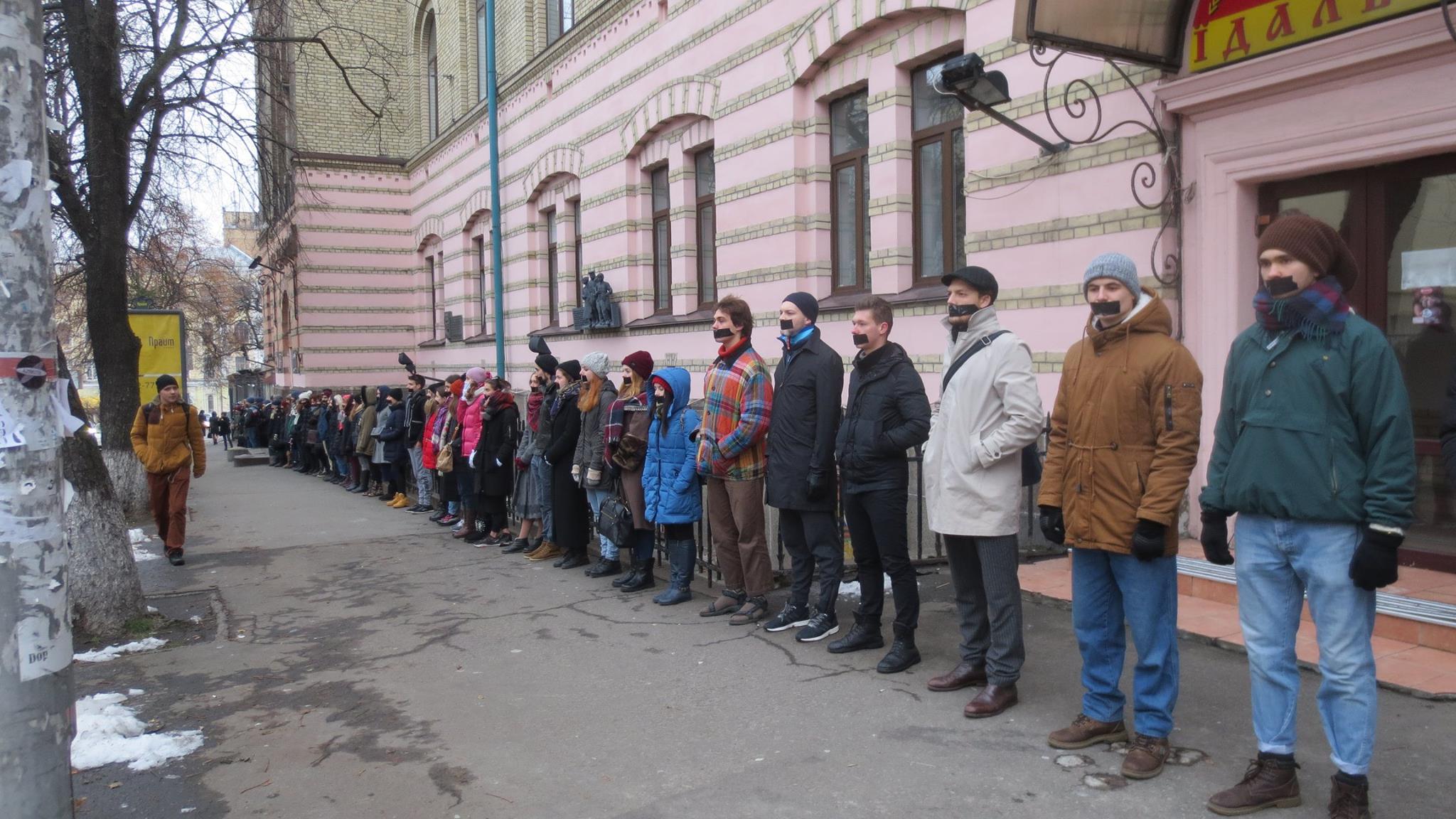 Близько сотні студентів Київського національного університету театру, кіно і телебачення імені І. К. Карпенка-Карого влаштували мовчазний протест проти бездіяльності ректорату і підвищення вартості навчання у понеділок. Студенти заклеїли скотчем свої рти і вишикувалися перед будівлею університету.