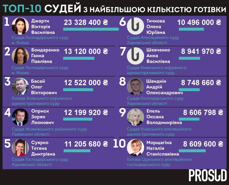 Також активісти проекту Prosud склали список ТОП-10 суддів та їх родин з найбільшою кількістю готівки.