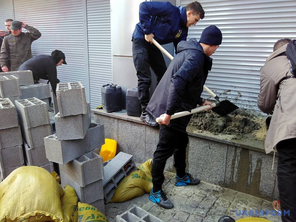 Відділення "Сбєрбанку Росії" на вулиці Володимирській у Києві кілька десятків активістів з прапорами Правого сектору та Національного корпусу замурували за допомогою бетонних блоків та цементу.