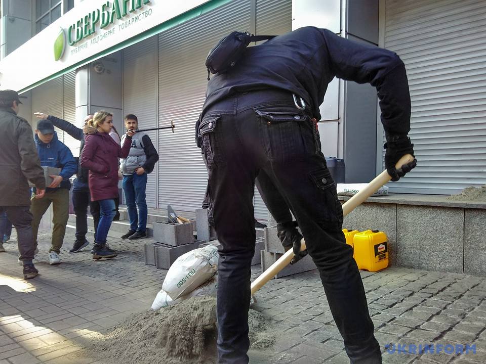 Активісти принесли будівельні блоки та цемент, із яких споруджують стіну перед входом до “Сбербанку”. Крім того, за допомогою балончиків іх фарбою вони наносять різноманітні написи на ролети, якими закриті вікна банку.