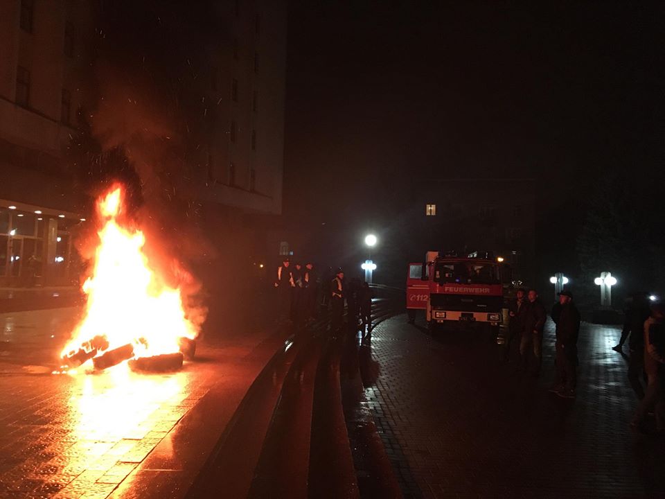 Під Івано-Франківською ОДА також палали шини, тому туди прибули рятувальники на пожежних машинах.