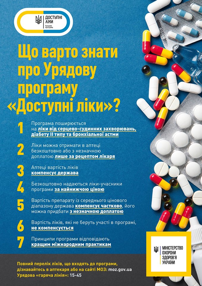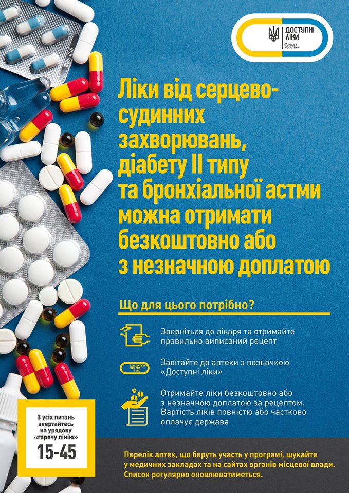 Урядова програма «Доступні ліки» стартувала в Україні 1 квітня. Програма надає можливість кожному українцю отримати безкоштовно або з незначною доплатою ліки за трьома категоріями: серцево-судинні захворювання, бронхіальна астма, діабет II типу.