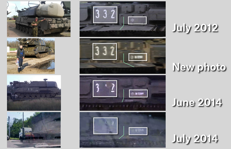 «Команді Bellingcat вдалося виявити «відсутню ланку» – фотографію, на якій видно маркування негабаритного вантажу на «Бук 332», зняту до його транспортування в колоні в червні 2014 року. На фотографії, знятій російським механіком, ймовірно, навесні 2013 року, видно «Бук 332» з тими ж білими транспортними маркуванням, що було видно на ньому в Україні незадовго до і незабаром після збиття MH17. Ця фотографія «Бука 332», на якій повністю видно бортовий номер, а також маркування негабаритного вантажу, – остання за часом зйомки з виявлених нами, знятих до його транспортування в колоні в червні 2014 року, коли друга цифра бортового номера була вже зафарбована», – зазначають дослідники.