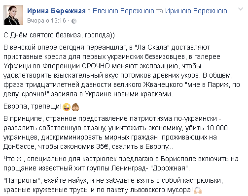 "Дивне бачення патріотизму по-українськи - розвалити власну країну, знищити економіку, вбити 10.000 українців, дискримінувати мирних громадян, які живуть на Донбасі, щоб, зекономивши 35 євро, звалити у Європу" , - написала Бережна.