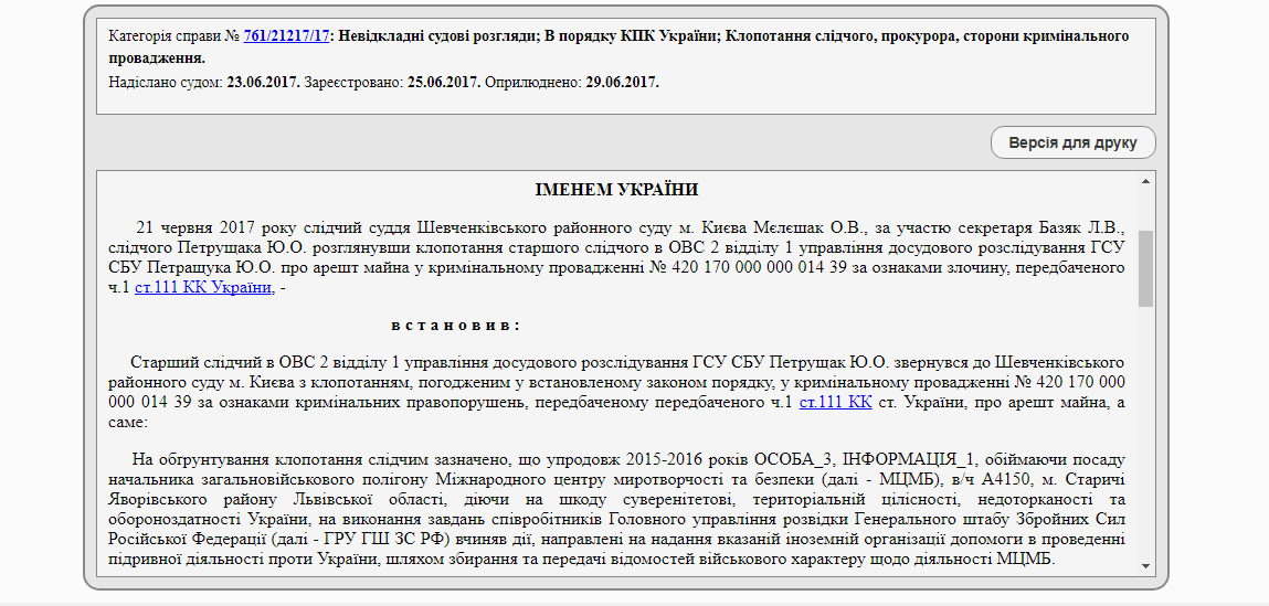 Пізніше в прес-службі Міжнародного центру миротворчості та безпеки підтвердили, що в постанові суду йдеться не про начальника Яворівського полігону.