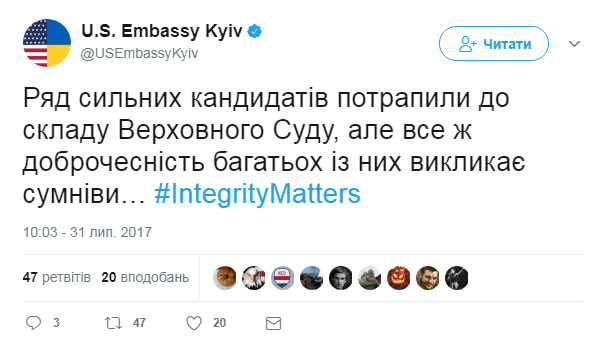 Посольство США в Україні оприлюднило заяву в якій відзначило, що доброчесність деяких кандидатів на посади судей Верховного суду України викликає занепокоєння.