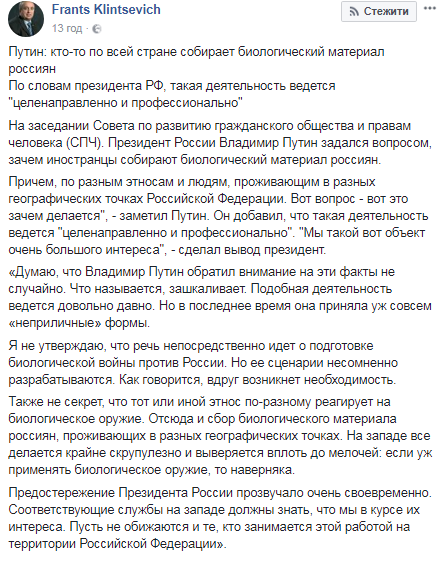 "Я не стверджую, що речь безпосередньо йде про підготовку біологічної війни проти Росії. Але її сценарії без сумніву розробляються. Як мовиться, раптом виникне необхідність.Також не секрет, що той чи інший етнос по-різному реагує на біологічну зброю. Звідси і збір біологічного матеріалу росіян, що мешкають в різних географічних точках. На Заході все робиться надзвичайно ретельно і перевіряється до дрібниць: якщо вже використовувати біологічну зброю, то вже напевне", - написав Франц Клінцевич.