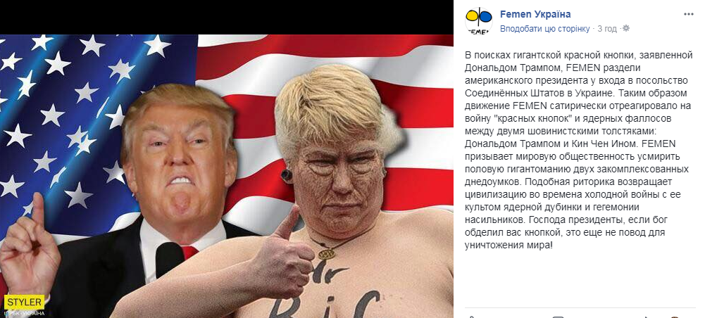 "У пошуках гігантської червоної кнопки, заявленої Дональдом Трампом, Femen роздягнули американського президента біля входу в посольство Сполучених Штатів в Україні. Таким чином рух FEMEN сатирично відреагував на війну "червоних кнопок" і ядерних фалосів між двома шовіністичними товстунами: Дональдом Трампом і Кін Чен Іном", - написали повідомленні на сторінці організації в Facebook, зробивши помилку в прізвищі лідера Північної Кореї.