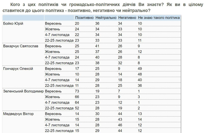 Частка тих, хто ставиться до Зеленського негативно, протягом осені зростала: 7% в вересні, 9% в жовтні, 12% на початку листопада, 19% в кінці листопада".