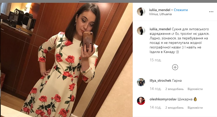 "Сукня для литовського відрядження. Ох, тролінг не вдався. Гаразд, зізнаюся, за час перебування на посаді я не переплутала жодної географічної назви. І навіть не їздила в Канаду", - написала вона.