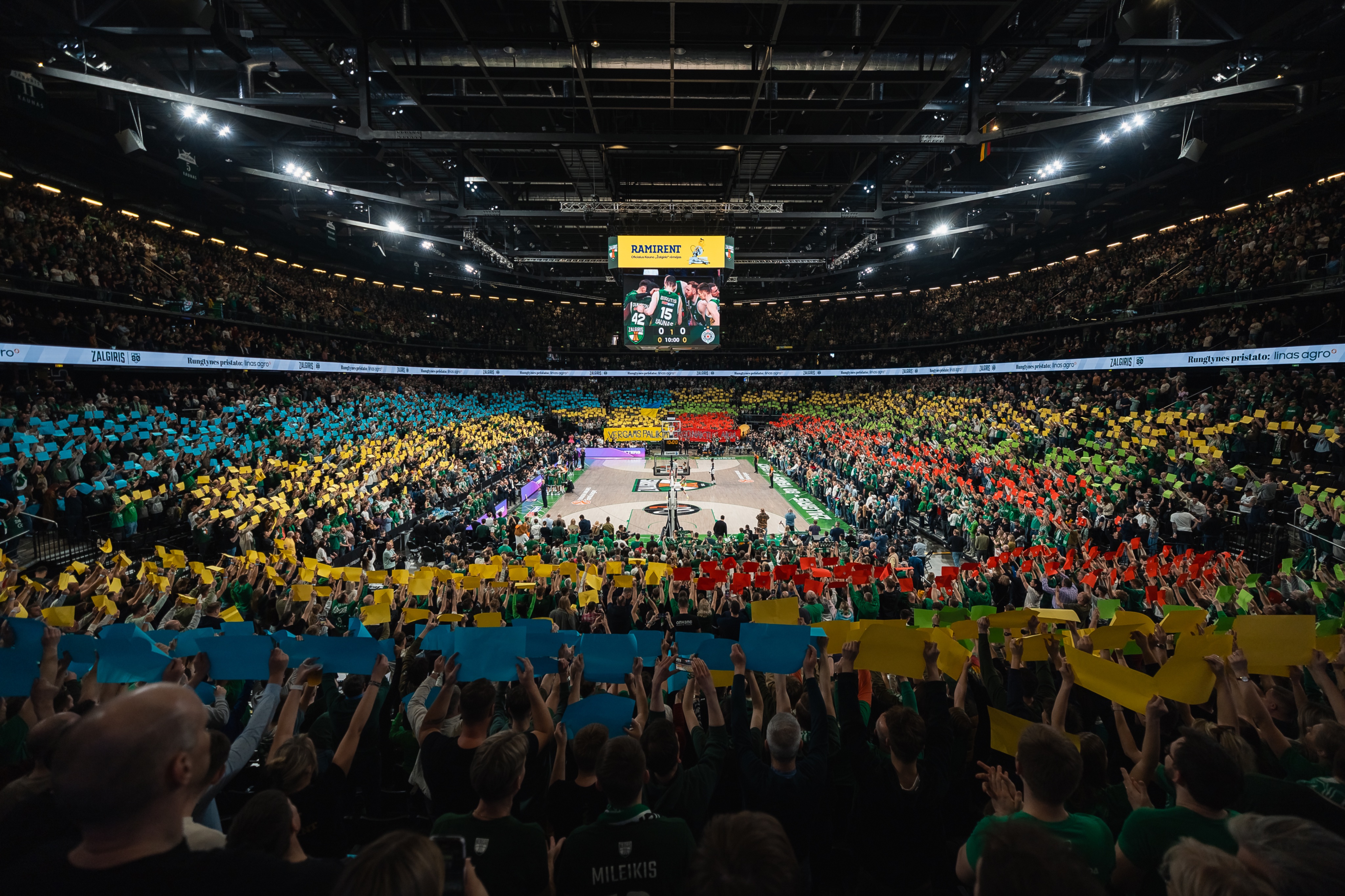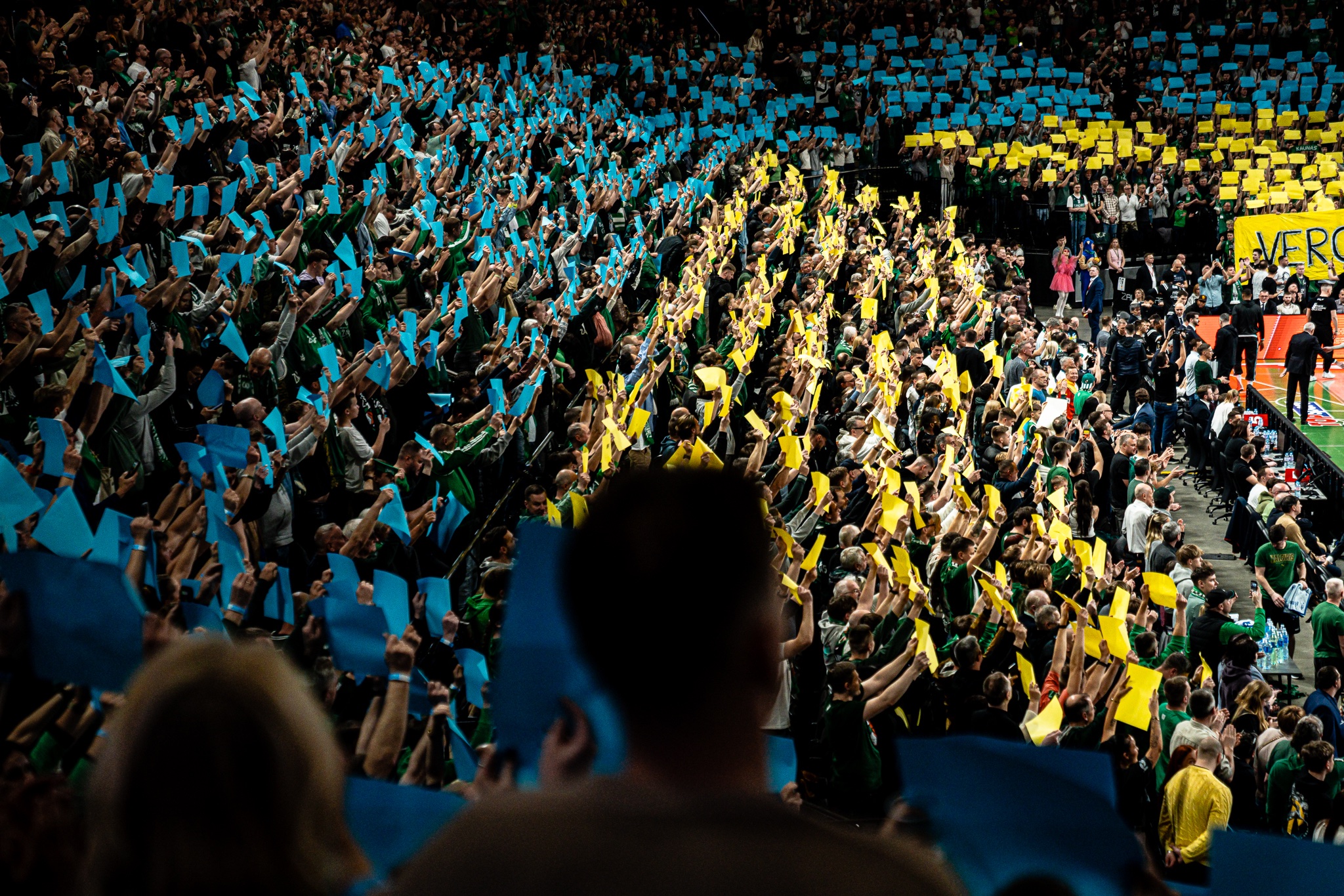на матчі Євроліги проукраїнський перформанс влаштували фани литовського Жальгіріса. (Фото: соцмережі Х BC Zalgiris Kaunas.)