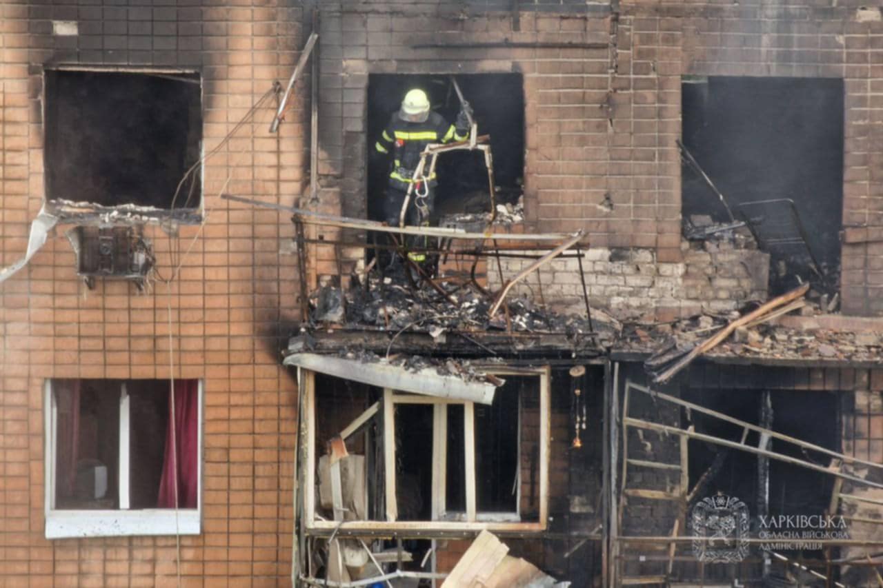 В Основ’янському районі безпілотник влучив у дев’ятиповерховий житловий будинок. Вогонь охопив 12 квартир на сьомому, восьмому та дев’ятому поверхах – загальна площа займання склала 600 кв. м. З-під завалів рятувальники дістали жінку, якій надають медичну допомогу. Окрім того, згоріли два автомобілі.
