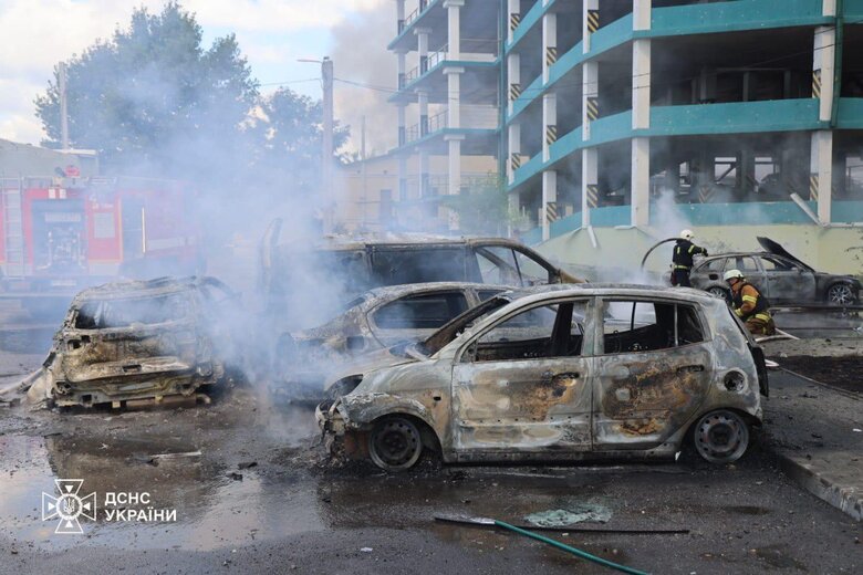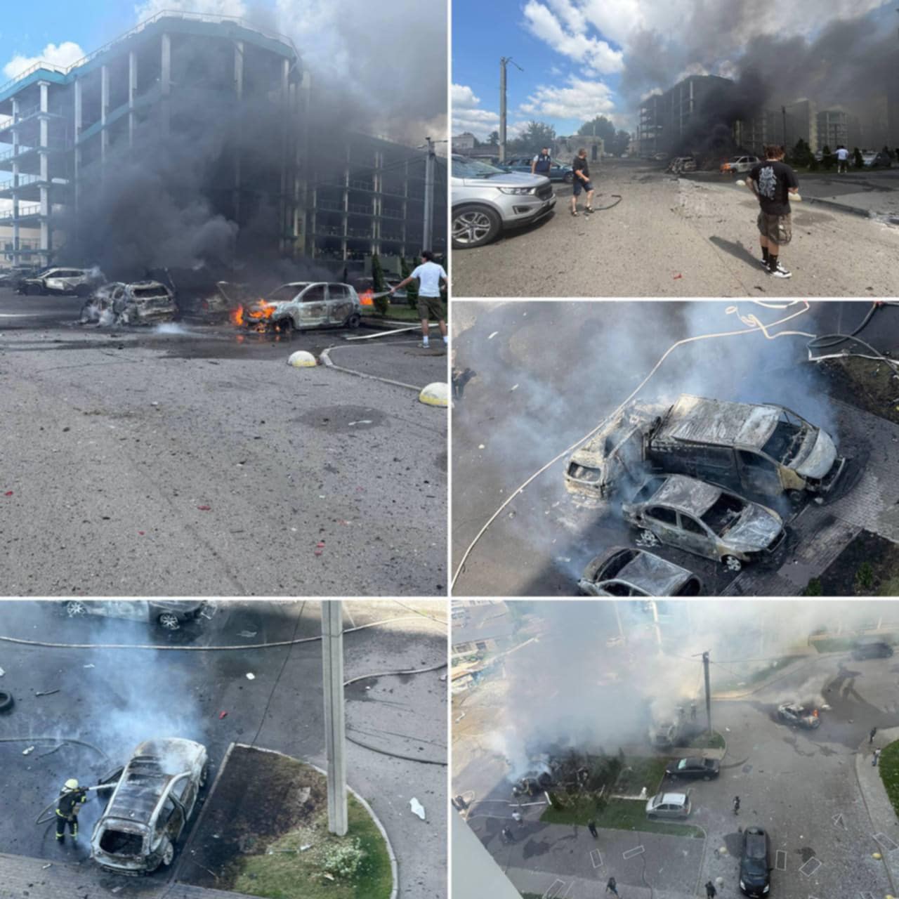 Трохи пізніше він уточнив, що влучання було поряд з багатоповерховим будинком. На місці горять близько 15 авто.