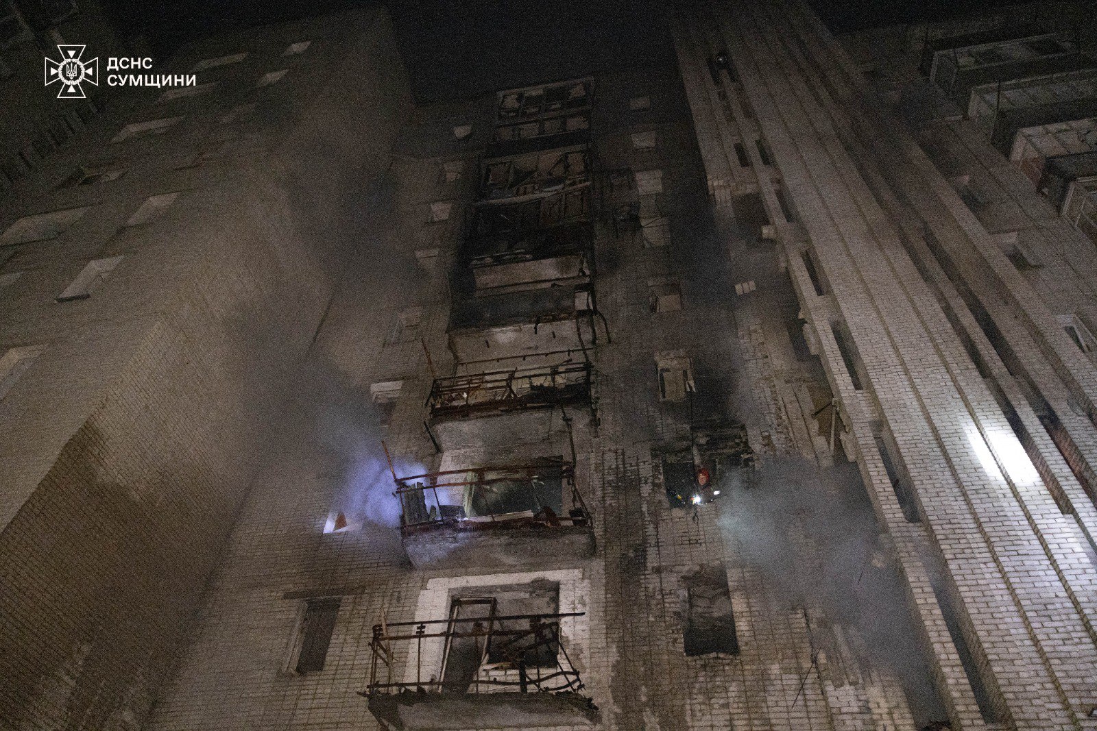У м. Охтирка ворожі БпЛА завдали ударів по 9-ти поверховому житловому будинку. (Фото: ДСНС)