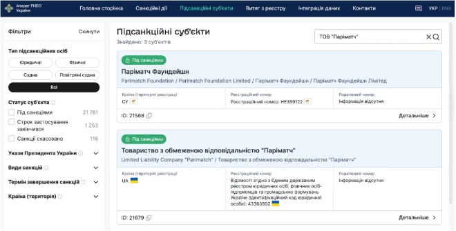 Найбільш показовий кейс цього періоду — підсанкційний букмекер Parimatch. У березні 2023 року президент підписав указ про санкції проти структур компанії — строком на 50 років — через підозри у продовженні роботи в рф та Білорусі після вторгнення. На рахунках заблокували 250 млн грн клієнтських коштів.