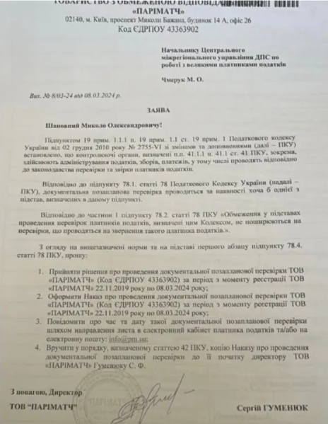 Скеровано відповідну заяву ТОВ "Паріматч" щодо проведення документальної позапланової перевірки.