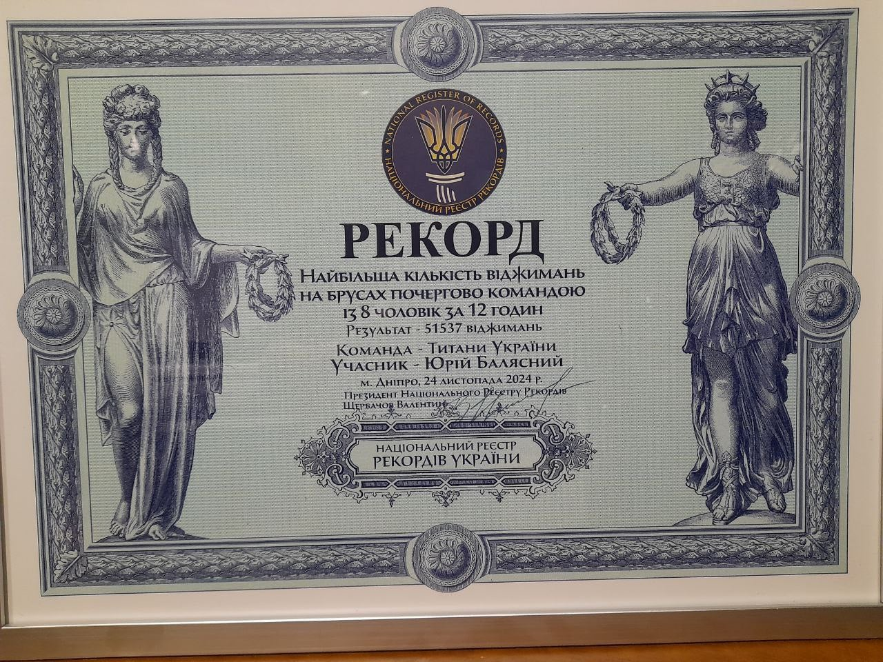 «До нашої сімейної компанії приєднався також Артем Куриленко — товариш мого сина і син мого товариша Олександра Куриленка, який загинув на війні у квітні 2022 року. Артем став мені другим сином. Стараюсь йому по-чоловічому допомагати. Моя участь у встановленні рекорду була присвячена також і пам’яті його батька», — каже Юрій Балясний.
