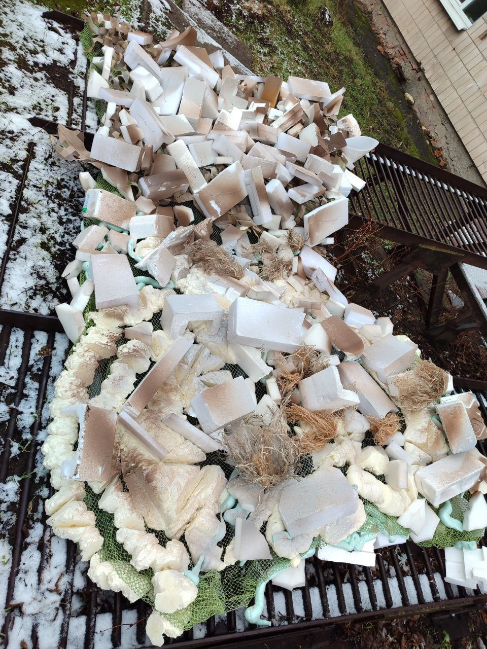 Уважно роздивившись фотографії, майстрині з плетення маскувальних сіток дійшли висновку, що для створення сітки з ефектом 3D їм потрібні легкі матеріали — поролон і пінопласт.