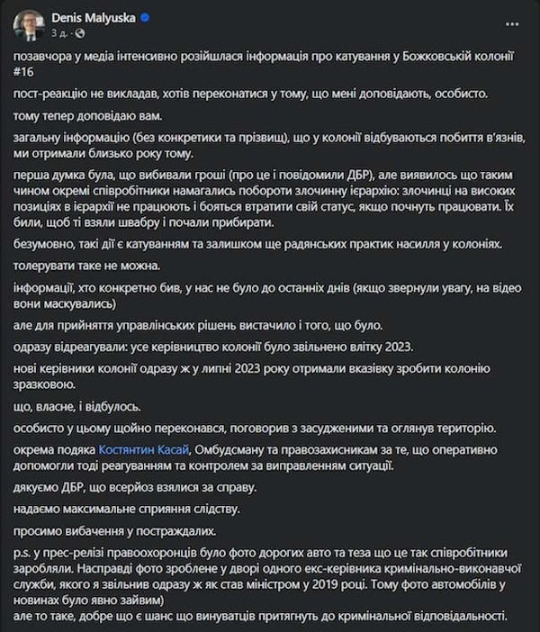 «Таким чином окремі співробітники намагались побороти злочинну ієрархію: злочинці на високих позиціях в ієрархії не працюють і бояться втратити свій статус, якщо почнуть працювати. Їх били, щоб ті взяли швабру і почали прибирати», — його слова у фейсбуці прозвучали не стільки як підтвердження встановлених фактів, стільки як намагання пояснити причини «залишків радянських практик насилля».