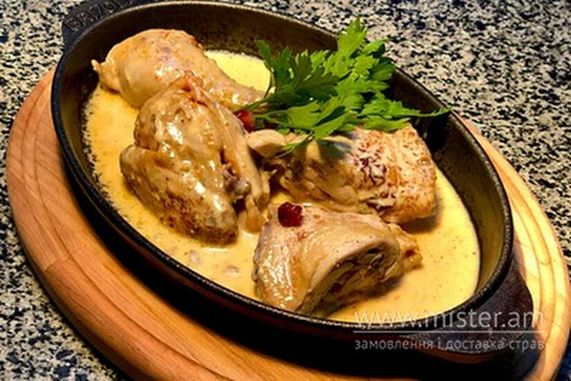 Отож беремо кілограм курятини (найкраще невеличке курча, але підійдуть і четвертинки), пакетик (200 мл) вершків, 1,5 ч. л. солі, 1 ч. л. хмелі-сунелі, 5-6 зубчиків часнику, кілька гілочок кіндзи (вона має надто сильний аромат і тому не всі українці її люблять, але можна замінити її петрушкою), кілька ложок олії для смаження.