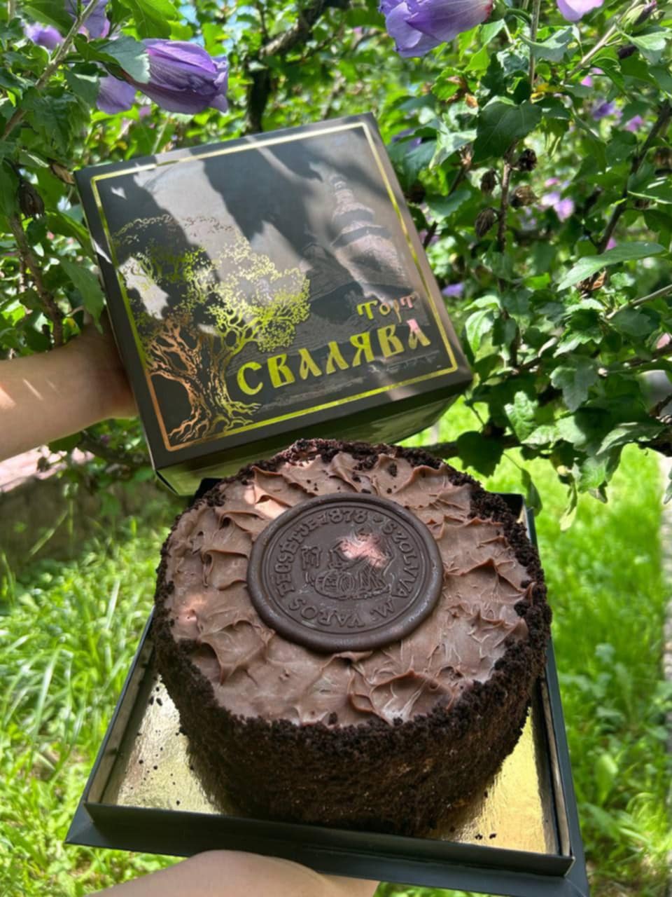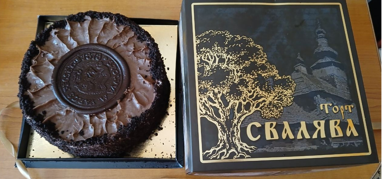Тепер зверху торта можна побачити шоколадну печатку, на якій зображено чоловіка, що наливає воду в бочку. Бо Свалявщина — це край мінеральних вод, які свого часу навіть доправляли до королівських дворів.