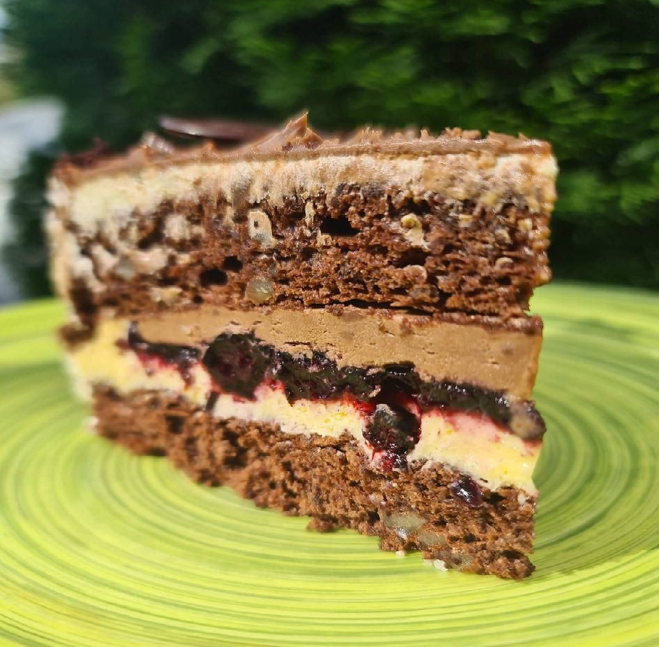 Ну а тепер, власне, про сам торт. Бо я спробувала — і це було незабутньо. Бісквіт у ньому шоколадно-білковий з мигдальним борошном. Прошарок або конфі, як поправила мене Мирослава, ожиново-чорничний. У ньому певний симбіоз желейності кисло-солодких ягід.