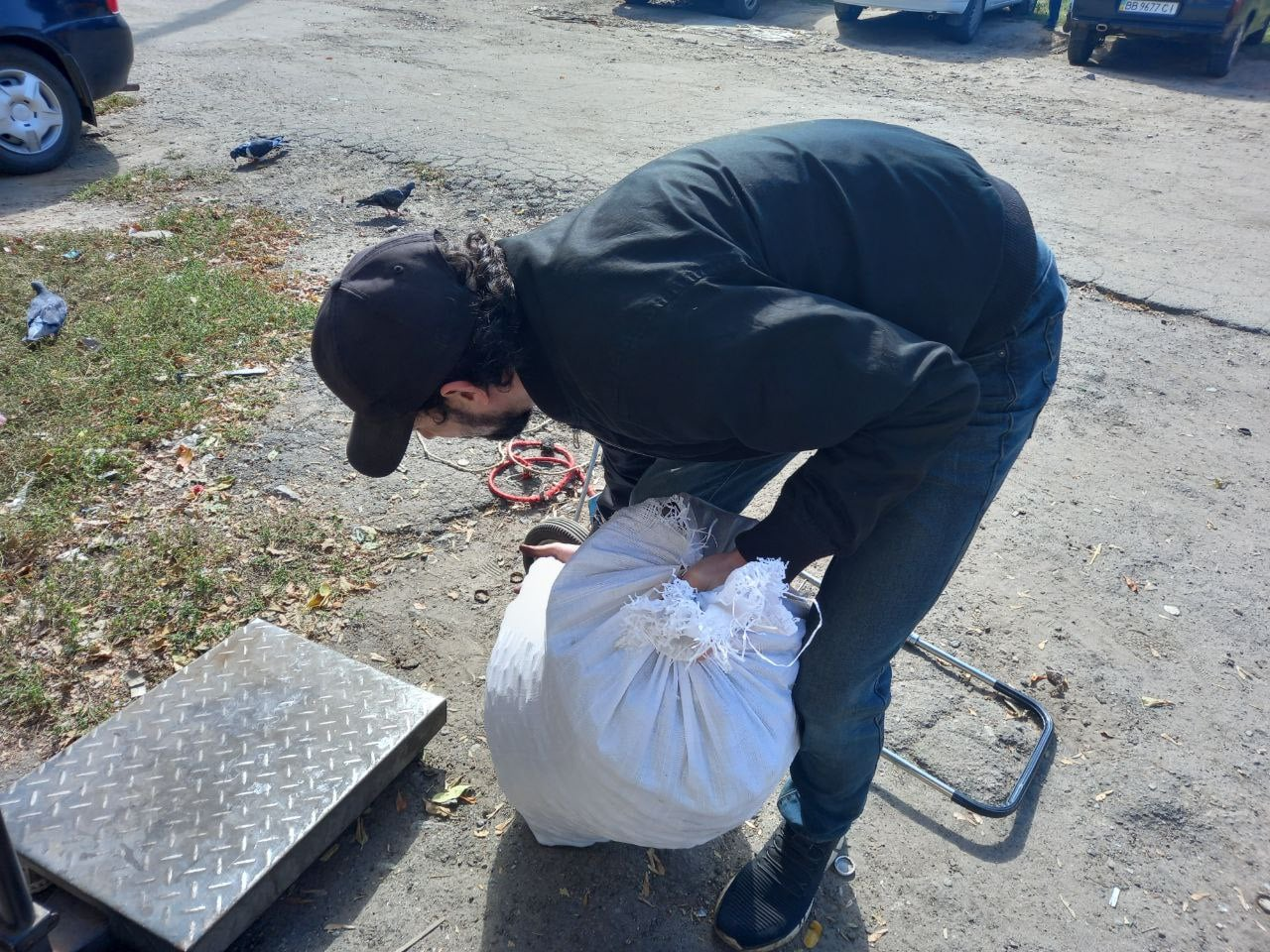 Поки я розмовляю з жінкою, до пункту прямує високий худорлявий чоловік середніх років, тягнучи за собою саморобний возик на колесах, на якому влігся великий білий мішок. Ледве стягнув його, щоб поставити на ваги.