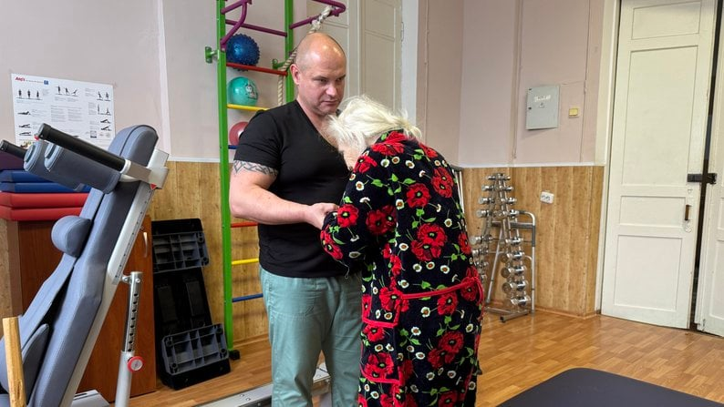 Фізичний терапевт Роман Литвинов, який допомагає Лідії Іванівні розробляти кінцівки, впевнений, що вона зможе обслуговувати себе в побуті. І дуже радіє її першим, хай і маленьким, крокам.