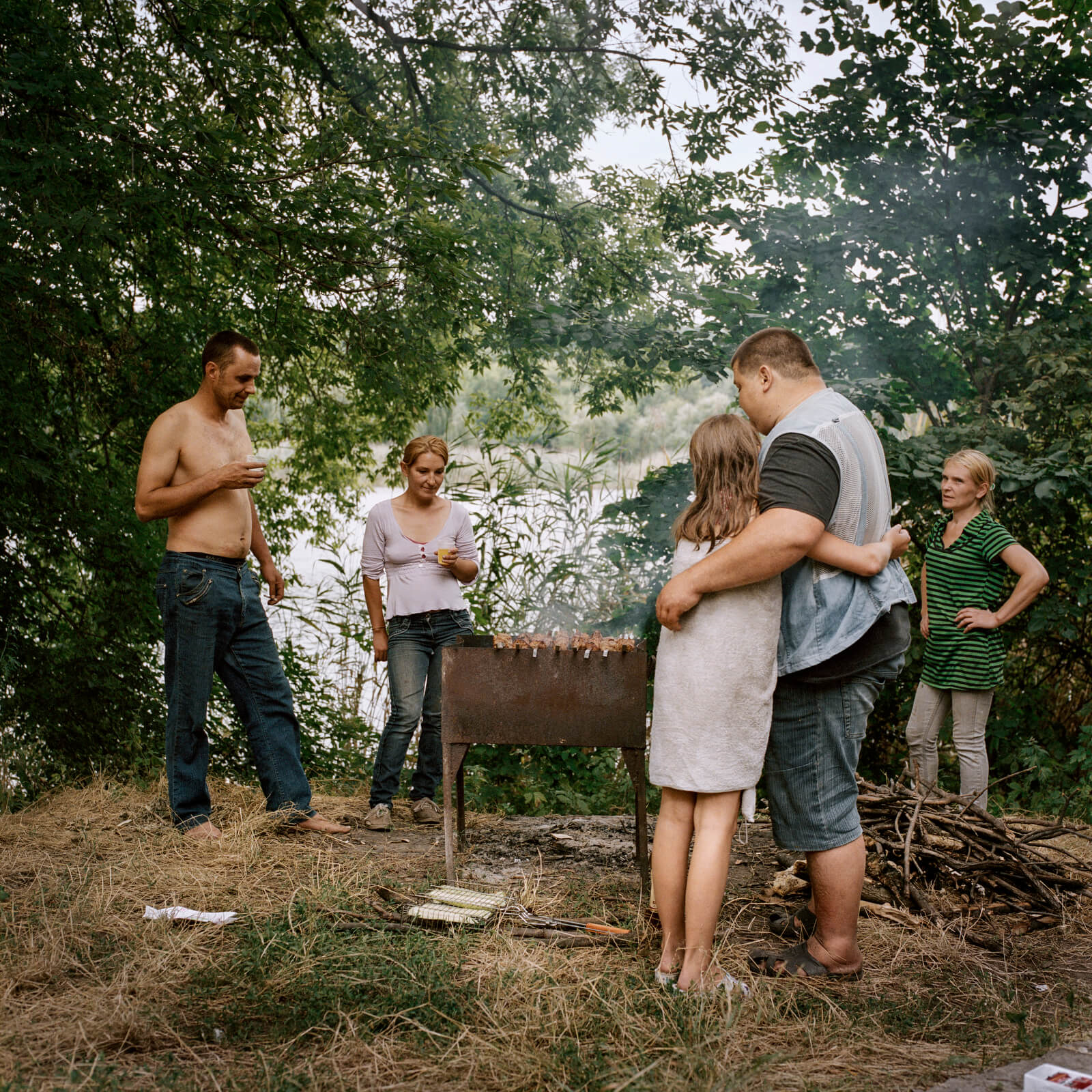 Фото зроблене у 2019 році. Тут родина зібралася на пікнік. Разом із ними — Олина сестра Вікторія, її хлопець та його дочка від попереднього шлюбу. Раніше вони смажили шашлики в лісі неподалік дому. Але з 2014-го ліс вважається забрудненим протипіхотними мінами і небезпечним для перебування. На щастя, хлопець Вікторії має автівку, тож вони можуть приїхати на озеро. Їм подобається ця галявина — діти й дорослі купаються, а після обіду ходять збирати гриби в іншому, безпечному, лісі».