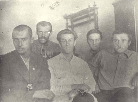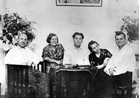 Павло Тичина з дружиною Лідією (в центрі), братами Іваном (ліворуч) та Євгеном і його дружиною Варварою.