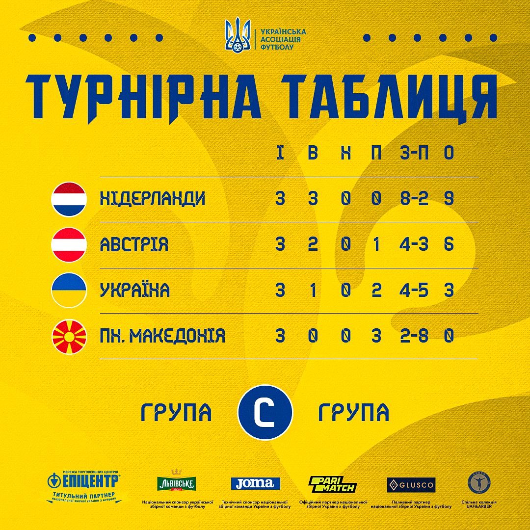 Підсумкове турнірне становище: Нідерланди - 9 очок, Австрія - 6, Україна - 3, Північна Македонія - 0.