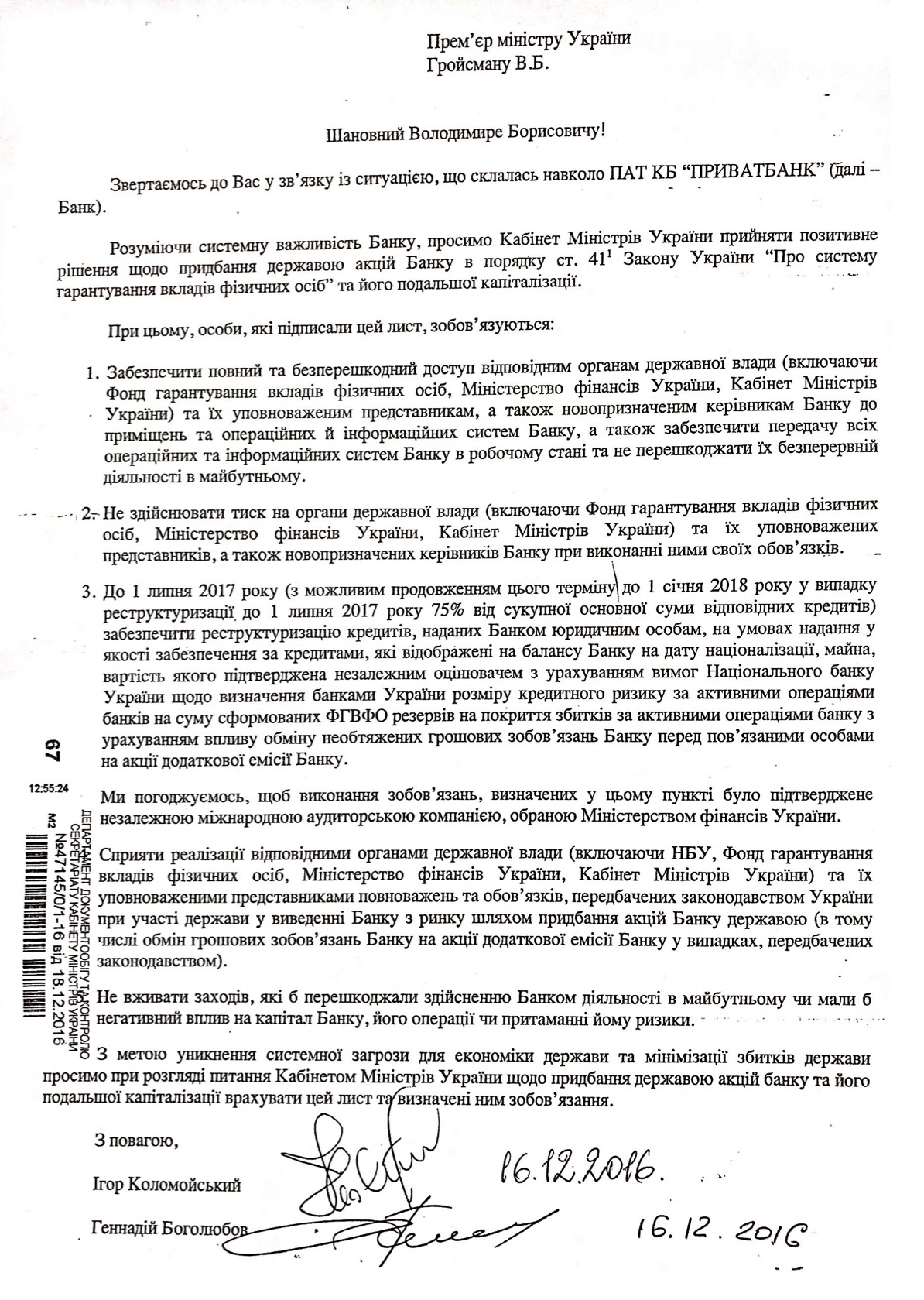 Міністерство фінансів України оприлюднило лист від 16 грудня 2016 року прем'єр-міністру України Володимиру Гройсману від колишніх найбільших акціонерів Приватбанку Ігоря Коломойського і Геннадія Боголюбова з проханням придбати акції банку і прийняти позитивне рішення щодо його подальшої капіталізації.
