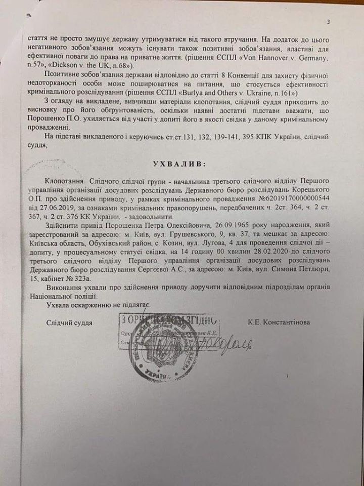 Згідно з цим рішенням, Порошенка кличуть на допит у справі, порушеній 27 червня 2019 року за ч.2 ст. 364 (зловживання владою або службовим становищем), ч.2 ст. 367 (службова недбалість) і ч.2 ст. 376 (втручання в діяльність судових органів) Кримінального кодексу.