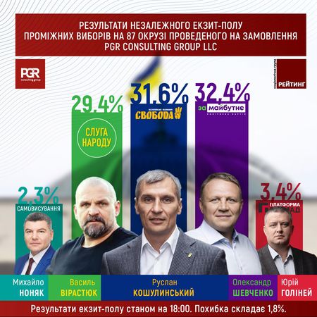 Представник партії "За майбутнє" Олександр Шевченко і представник ВО "Свобода" Руслан Кошулинський посіли перші дві сходинки на довиборах до Верховної Ради на одномандатному виборчому окрузі №87 в Івано-Франківській області.