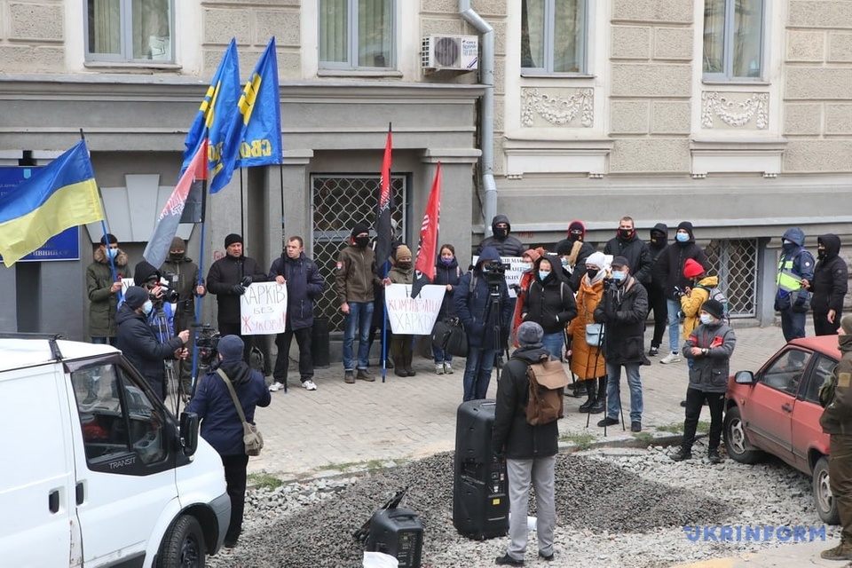 Активісти тримали у руках прапори України, червоно-чорні стяги та плакати: "Ні комунізації Харкова!", "Жуков - маршал смерті", "Харків - без Жукова" тощо.