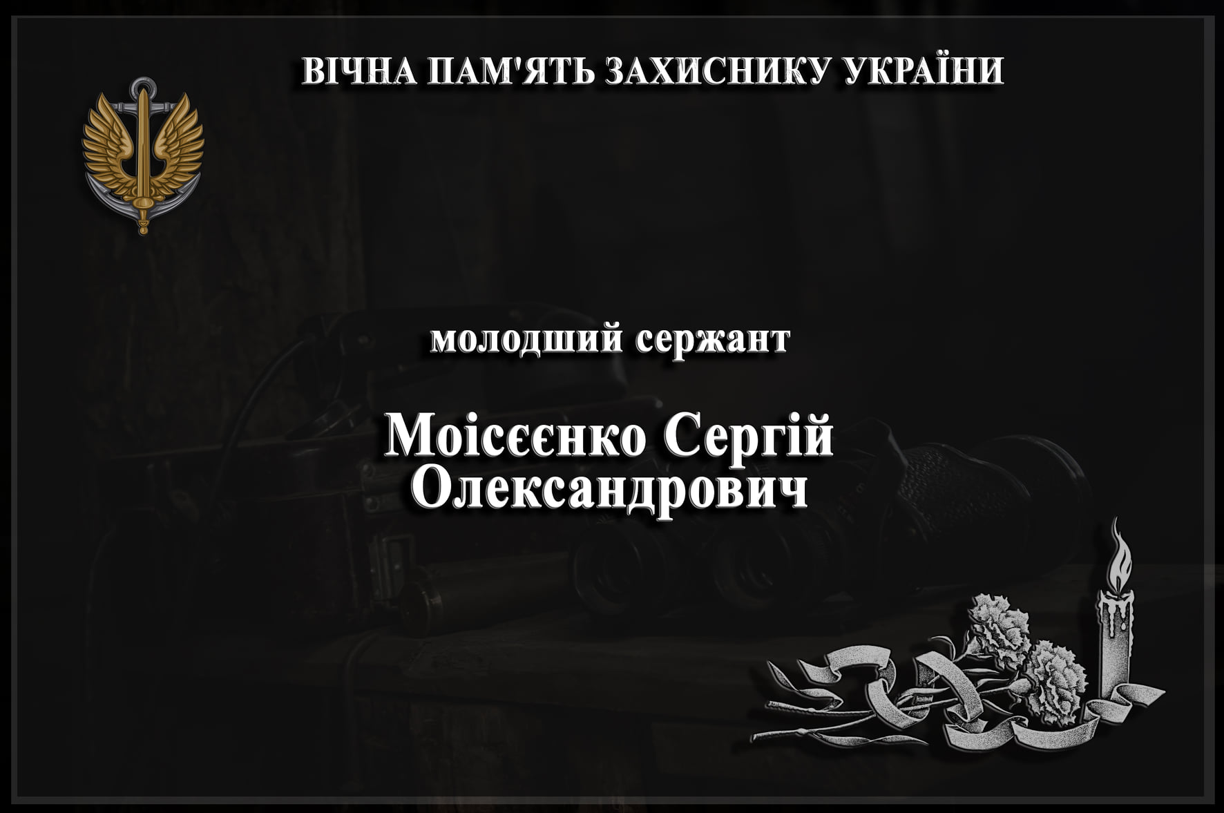 “З сумом повідомляємо, що в районі проведення операції Об’єднаних сил, захищаючи суверенітет і територіальну цілісність України, в результаті ведення противником обстрілу позицій зі стрілецької та снайперської зброї загинув наш побратим молодший сержант Моісєєнко Сергій Олександрович“, – повідомили у 36-й окремій бригаді морської піхоти імені контрадмірала Михайла Білинського.