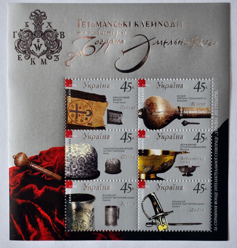 Блок марок "Укрпошти", присвячених Гетьманським клейнодам і особистим речам гетьмана Хмельницького.
