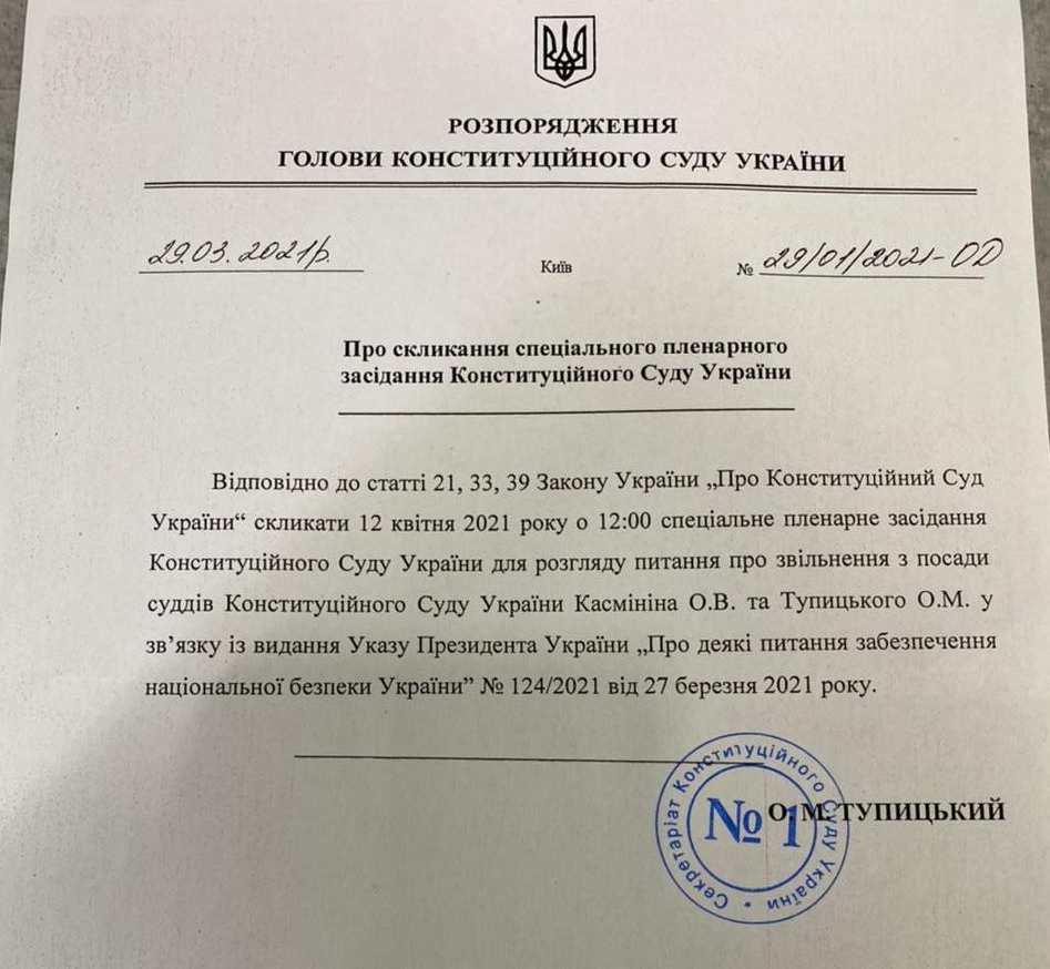 «Тому я сьогодні видав розпорядження про скликання спеціального пленарного засідання на 12 квітня на 12.00 про розгляд питання про звільнення суддів Касмініна і Тупицького», - каже відсторонений голова КСУ.