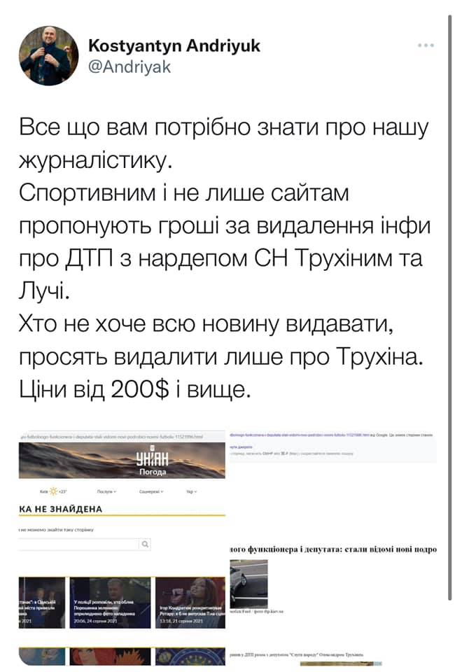 Зауважимо, що за даними ЗМІ, 23 серпня народний депутат фракції "Слуга народу" Олександр Трухін, будучи напідпитку, спричинив ДТП дорогою з Полтави до Києва, але згодом близько тридцяти (!) медіа почистили повідомлення про цю аварію, в якій постраждали шестеро осіб.