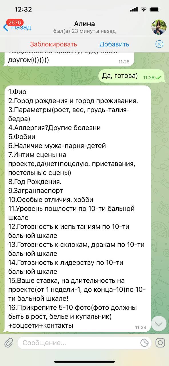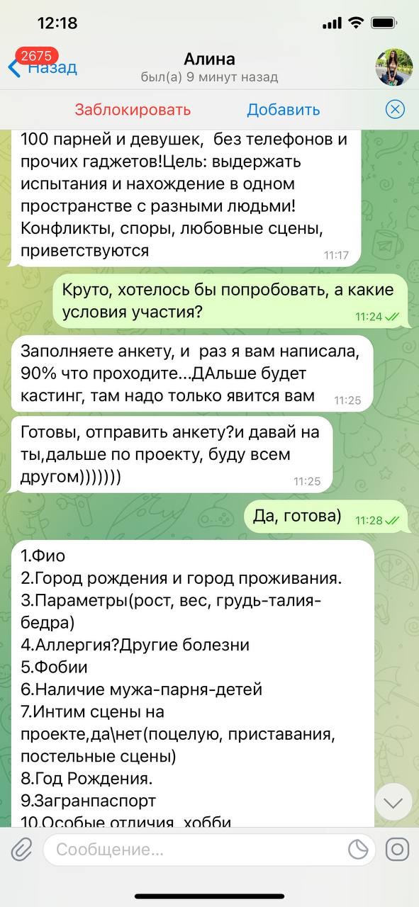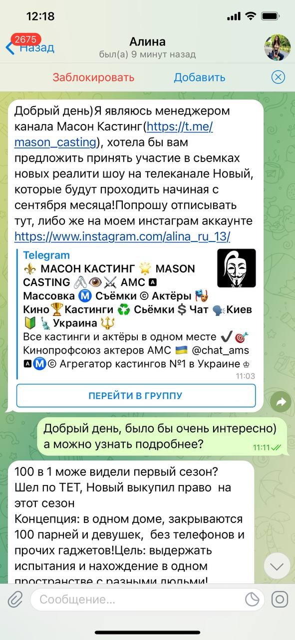 «Ми перевірили інформацію по групах кастингів і знайшли коментарі про менеджера Аліну, яка нібито підбирає учасників для проектів Нового каналу. Насправді це аферистка. Деякі користувачі в групах пишуть, що Аліна просила скинути їм інтимні фото та представлялася не лише менеджером Нового каналу, а й адміністратором чату з кастингом у Telegram», - каже Оніщенко.