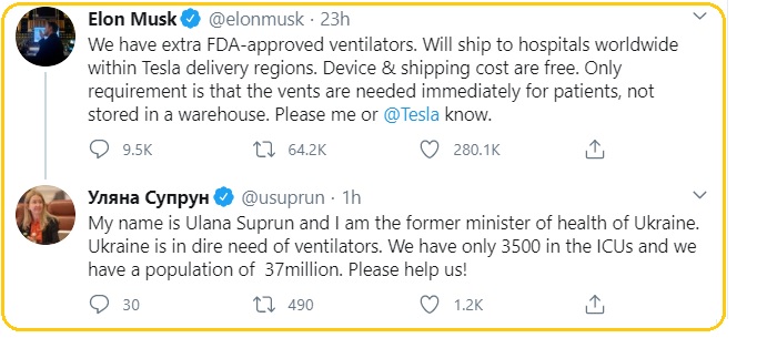 «Мене звуть Уляна Супрун, я колишній міністр охорони здоров’я України. Україна дуже потребує апаратів ШВЛ. У нас у відділеннях інтенсивної терапії їх лише 3 500, а населення - 37 мільйонів. Будь ласка, допоможіть нам!» - так Уляна Супрун прокоментувала вона твіт Ілона Маска, в якому бізнесмен запропонував безкоштовно надсилати в лікарні світу апарати ШВЛ для порятунку важких пацієнтів з коронавірусом COVID-19.